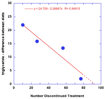 So, was the decline in performance due to including the made-up data from the drop outs? One way to get an idea of whether that is true is, for each time point, plot the number of people who discontinued treatment against triglycerides at that time point.