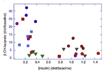 The figure below shows individual time points with different symbols for each patient. The figure shows, as expected, an inverse correlation between ketone bodies and insulin levels.