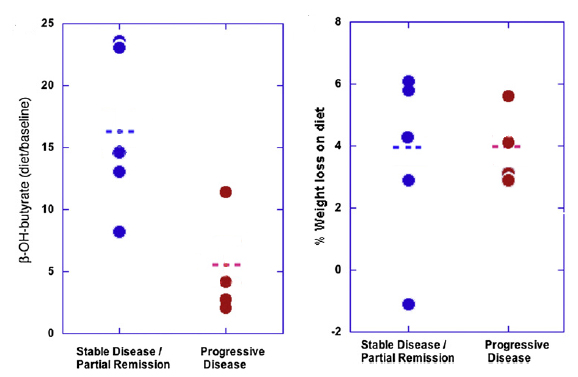 Although the study had a small n, several of these advanced cancer patients became stable or showed partial remission. It turned out that those who became stable or showed partial remission had the highest level of ketone bodies.  The figure below shows that the predictor of this outcome was ketonemia (ketone bodies in the blood).   Patients who demonstrated stable disease or partial remission had a three-fold higher average ketotic response compared to those with continued progressive disease. In distinction, both groups had similar calorie deficits or, as shown below, degree of weight loss.