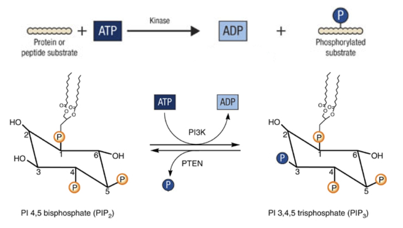 It is not necessary to know the actual biochemistry in the PI3K-PTEN step but it has some general import in biochemistry and I will try to explain it. Many (hundreds) of the reactions that go on living cells involve transfer of phosphate groups from ATP to substrates (phosphorylation) and the reverse (de-phosphorylation; hydrolysis).  Some proteins or enzymes become more active when phosphorylated and some become less active. It is not an exaggeration to say that the functional metabolic state of the cell is represented in the matrix of phosphorylated and un-phosphorylated proteins and small molecules.  The basic chemical reaction is shown below along with the specific reactions catalyzed by PI3K and PTEN.
