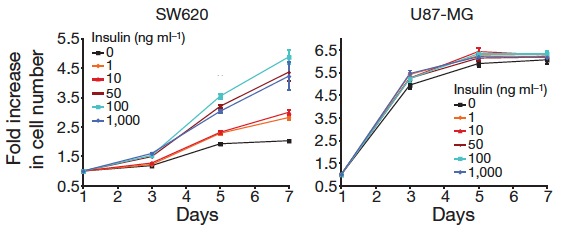 What could account for this difference? Consistent with previous reports in the literature, all of the mice in the study showed significant decreases in circulating levels of insulin so the effect wasn’t in the level of hormone, per se.  There was a difference, however. When the cells from the different tumors were isolated and grown in tissue culture medium, it was found that the growth of cells from the DR-sensitive mice were stimulated by increasing amounts of insulin. Cells from those tumors that did not respond to calorie reduction grew whether insulin was there or not. In other words, diet-sensitivity had something to do with insulin-sensitivity.