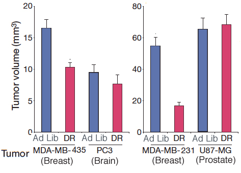 To get an idea of where this becomes important we’ll look at a beautiful and compelling study by Kalaany & Sabatini entitled “Tumours with PI3K activation are resistant to dietary restriction.”  The starting point for that study was, again, the long-standing observation that dietary caloric restriction is capable of causing a decrease in the growth rate or even the incidence of some cancers. The experimental model in Kalaany & Sabatini was a collection of (non-obese diabetic, severe combined immunodeficient) mice into which human tumors had been grafted, so-called exo-grafts.  It turned out that some of these tumors were sensitive to dietary restriction (DR; 60 % of energy requirements vs controls allowed to feed ad libitum). The difference in repression of growth between the DR and the ad lib mice for different tumors is shown below. In the tumors from breast, the tumor volume was significantly reduced (more than half in MDA-MB-231) on dietary restriction compared to ad lib feeding. The tumors from brain or prostate, however, grew to a constant volume regardless of their diet. (PC3 had a smaller volume then others but this was not further reduced by DR).