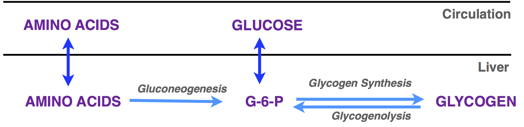 We now understand that the immediate source of blood glucose is usually from glycogen although GNG is going on almost all the time (contrary to the suggestion in some textbooks that GNG is a last-ditch effort after glycogen is gone). In other words, glucose made in GNG may be in the form of the metabolite glucose-6-phosphate (G-6-P) that can go into synthesis of glycogen and only later appear in the blood.  The bottom line: glucose uptake into the liver, glucose release into the blood, glycogen synthesis and breakdown and gluconeogenesis all go on at the same time, are directly connected. It is really all one process defining blood glucose control (Figure 5).