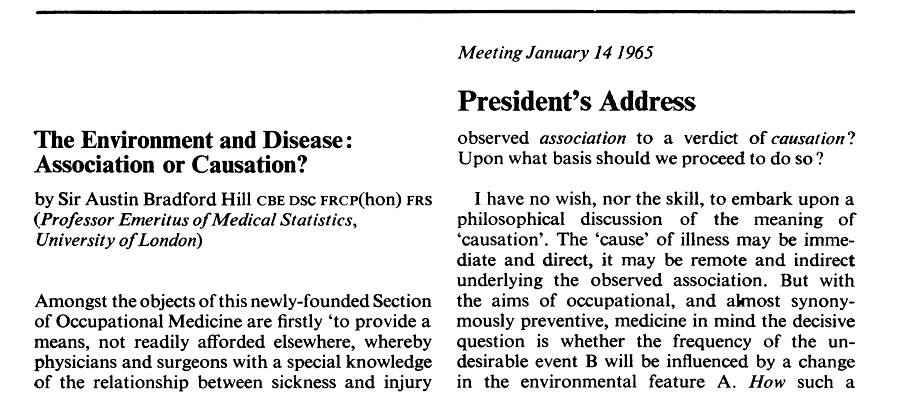 Wiki says: “in 1965, built upon the work of Hume and Popper, Hill suggested several aspects of causality in medicine and biology…” but his approach was not formal — he never referred to his principles as criteria — he recognized them as common sense behavior and his 1965 presentation to the Royal Society of Medicine, is a remarkably sober, intelligent document. Although described as an example of an article that, as here, has been read more often in quotations and paraphrases, it is worth reading the original even today.