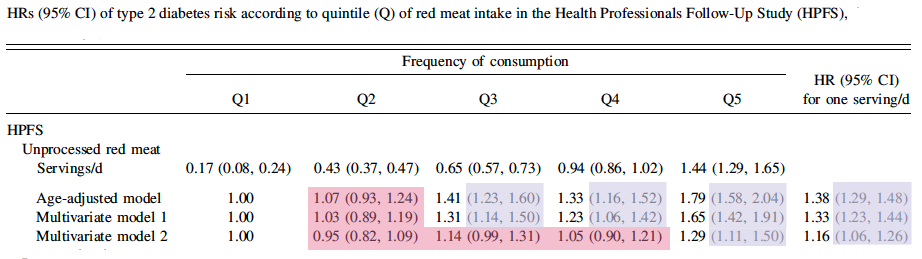 The hazard ratios for processed meat are somewhat higher but still less than 2. This is weak data and violates the first and most important of Hill’s criteria. As you go from quartile 2 to 3, there is an increase in risk, but at Q4, the risk goes down and then back up at Q5, in distinction to principle 5 which suggests the importance of dose-response curves. But, stepping back and asking what the whole idea is, asking why you would think that meat has a major — and isolatable role separate from everything else — in a disease of carbohydrate intolerance, you see that this is not rational, this is not science. And Pan is not making random observations. This is a test of the hypothesis that red meat causes diabetes. Most of us would say that it didn’t make any sense to test such a hypothesis but the results do not support the hypothesis.