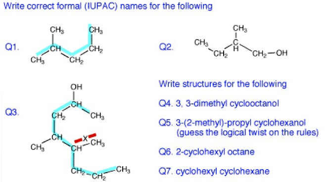Q1. The rule: find the longest continuous chain of carbon atoms, five in this case.  Consider as if it were derived from the five-carbon hydrocarbon, pentane. (“As if” because the real compound may not have been derived from pentane). Look for substituents (attached to the main chain.  There is a one carbon substituent, that is, a methyl group. Which carbon is it attached to? Count the carbons, trying each end. Use the one with the lowest number : 2-methyl pentane (not 4-methyl pentane). The compound is an isomer of hexane but the name is unambiguous which is the idea.