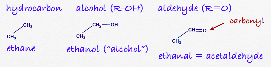 Organic compounds have two parts: a hydrocarbon backbone and a functional group, the non-hydrocarbon part that contains the chemically reactive part of the molecule, the functional groups. The assumption is that all compounds with the same functional group have similar chemistry. The millions of organic compounds are grouped into classes: alcohols, aldehydes, acids, sugars, amino acids, etc. based on which functional groups they contain. It’s easiest to understand by example.  Look at the alcohols.