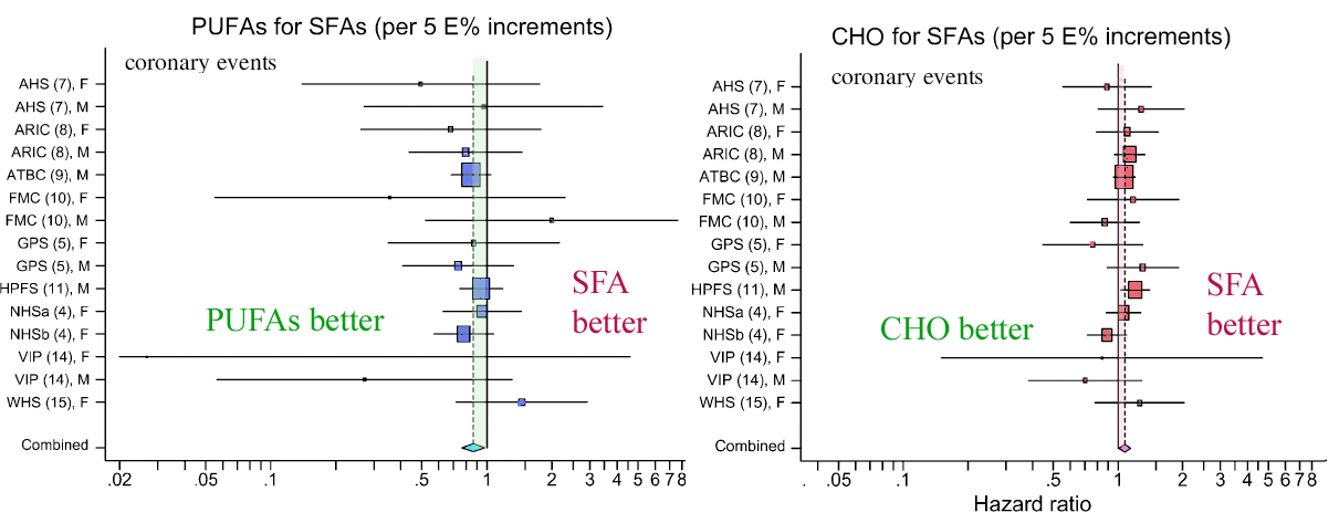 As in many nutritional papers, it is worthwhile to actually look at the data. The figure below, from Jakobsen’s paper shows the results from several studies in which the effect of substituting 5 % of energy from SFA with either carbohydrate (CHO) or PUFA or MUFA (not shown here) was measured. The outcome variable is the hazard ratio for incidence of coronary events (heart attack, sudden death). You can think of the hazard ratio as similar to an odds ratio which is what it sounds like: the comparative odds of different possible outcomes. The basic idea is that if 10 people in a group of 100 have a heart attack with saturated fat in their diet, the odds = 10 out of 100 or 1/10. If you now replace 5 % of energy with PUFAs for a different group of 100 and find only 8 people have an event, then the odds for the second group is 8/100 and the odds ratio is 0.8 (8/100 divided by 10/100). If the odds ratio were 1.0, then there would be no benefit either way, no difference if you keep SFAs or replace. So in the first figure below, most of the points are to the left of the point 1.0, suggesting that PUFA is better than SFA but the figure on the right suggests that SFA is better than CHO. But is this real?